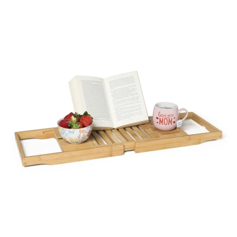 Geniet optimaal van het badderen met dit bamboe badrekje. Het rekje is voorzien van een standaard om een boek of tablet tegen aan te zetten. En een uitsparing waar je een lekker glas wijn in kunt zetten. Dat wordt genieten! Het badrek is uitschuifbaar van 70 tot 105 cm en past daarom altijd.
