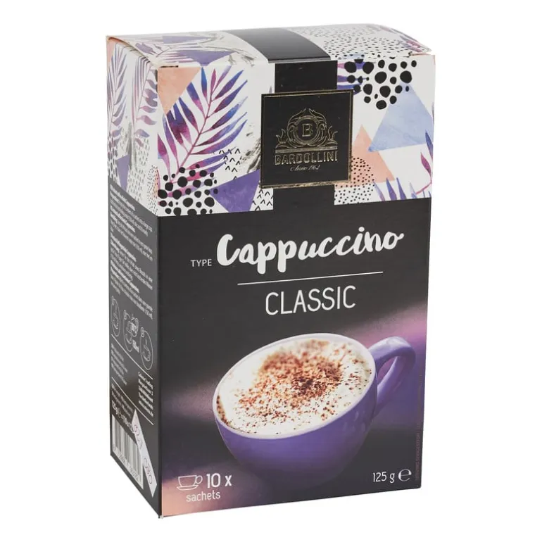 Maak heerlijke cappuccino met deze sachets van het merk Bardollini. Het enige dat je hoeft te doen is 150 ml heet, niet kokend water toe te voegen. Even roeren, en voilà, je hebt heerlijke cappuccino gemaakt. De verpakking bevat 8 zakjes.