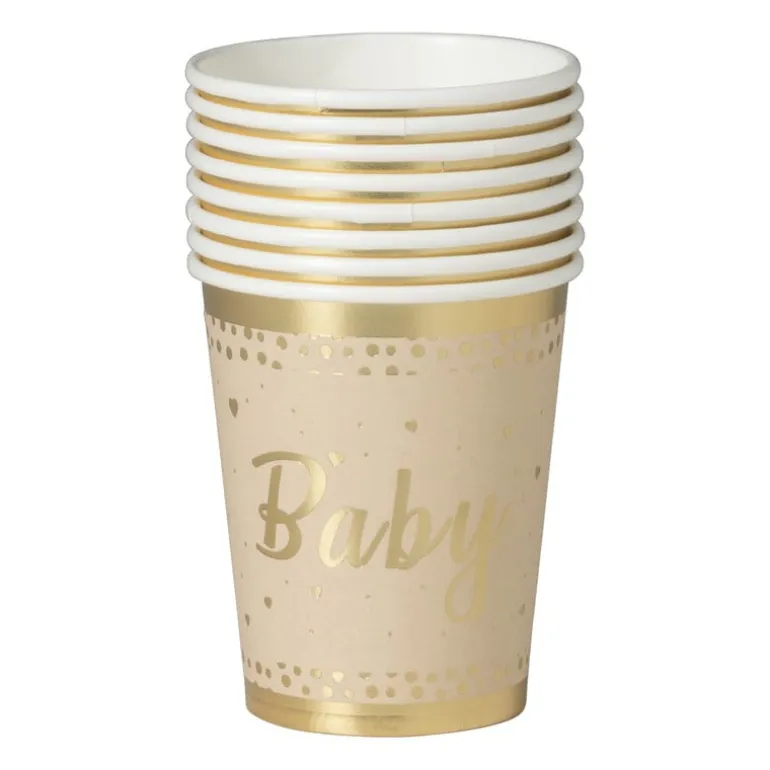 Deze set van 8 papieren bekers is perfect voor een babyshower. Dankzij de bruine kleur en elegante gouden details zorgen ze voor een feestelijke sfeer aan elke tafel. De wegwerpbekers zijn gemaakt van papier en de afmeting van de bekers is ø7×9 cm.