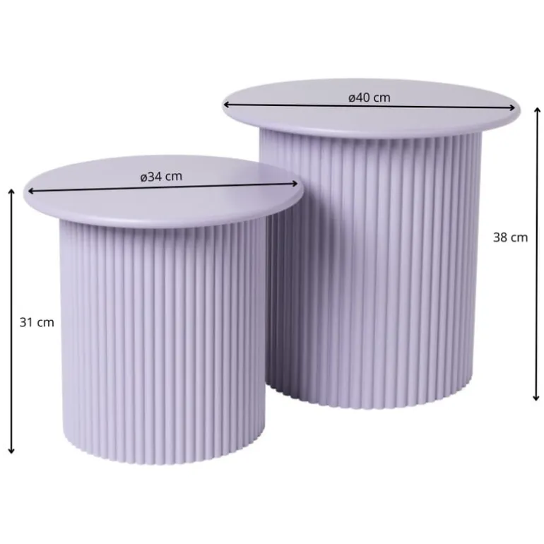 De bijzettafels komen in een set van 2. Bijzettafel 1 heeft een doorsnede van 40 cm en een hoogte van 38 cm. Bijzettafel 2 heeft een doorsnede van 34 cm en een hoogte van 31 cm.