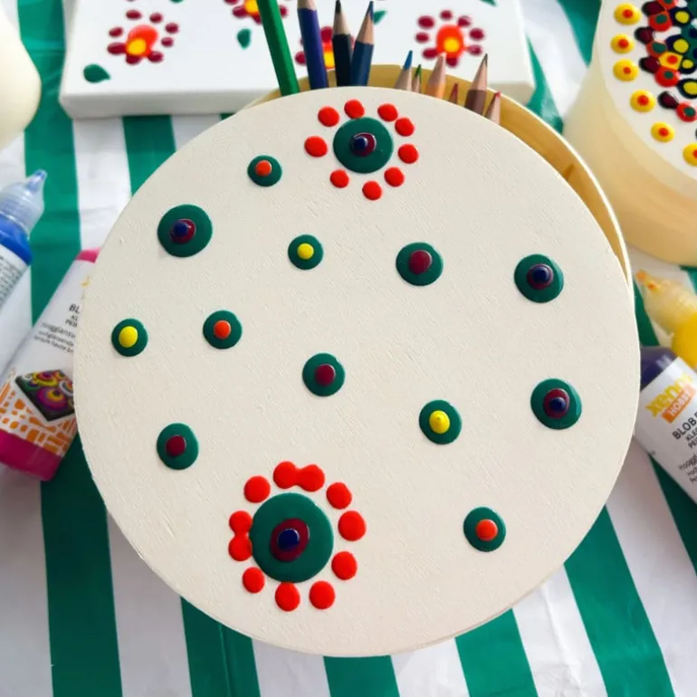 Blob verf is geschikt voor gebruik op verschillende oppervlakken, waaronder papier, karton, canvas, hout en zelfs stof. Het is een leuke en veelzijdige manier om creatief bezig te zijn en kunstwerken te maken met een unieke uitstraling. De verf geeft mooie cirkels en vloeit niet in elkaar over. Ga nat op nat te werk of laat elke laag een tijdje drogen voor een 3D-effect.