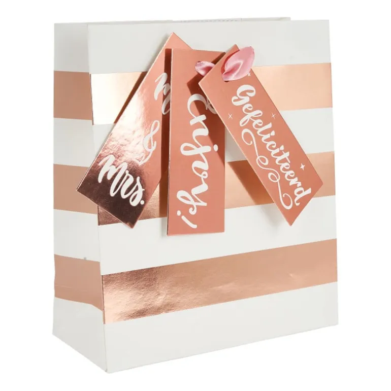 Met dit papieren cadeautasje verras je iemand op een leuke en makkelijke manier met verschillende cadeautjes. Met roségouden strepen. Er hangen verschillende labels aan voor verschillende gelegenheden. De tas is gemaakt van papier. De afmeting is 18×21 cm.