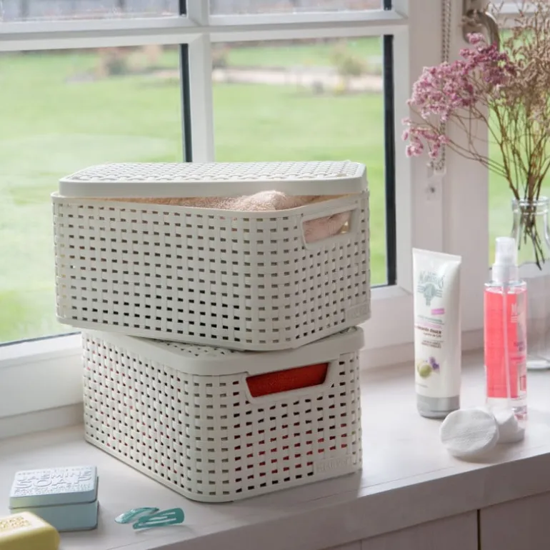 Stijlvol opbergen doe je met deze grijze opbergmand van Curver. Compact, stevig en voorzien van een handige deksel: perfect voor losse spulletjes in je badkamer, kast of bureau. De open structuur zorgt voor ventilatie, terwijl het moderne design in elk interieur past. De opbergboxen zijn voorzien van een vlechtstructuur die lijkt op natuurlijke materialen. Ze hebben de uitstraling van riet maar de voordelen van kunststof: eenvoudig te reinigen en gemakkelijk in gebruik. De opbergmanden hebben een handvat aan beide kanten en een deksel. Ook zijn de opbergmanden gemaakt van 70% gerecycled kunststof.