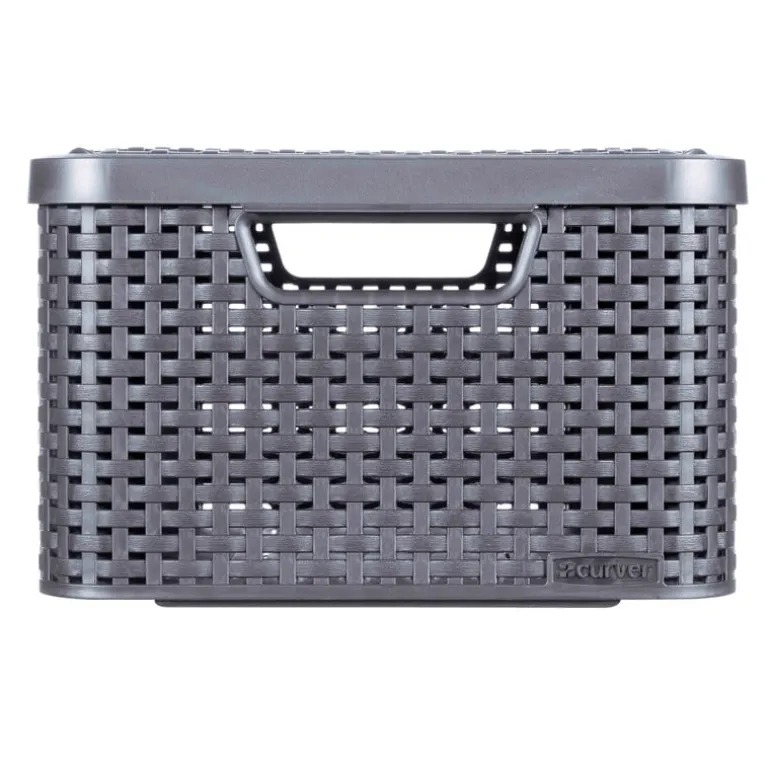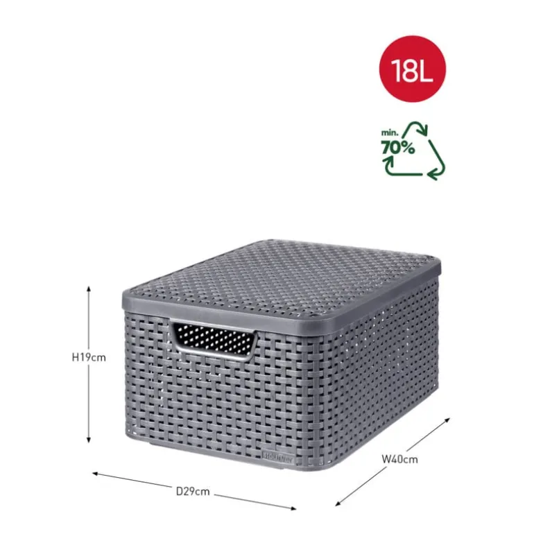 Deze middelgrote opbergmand van Curver is ideaal voor alles wat rondslingert in huis. Denk aan huishoudspullen, speelgoed of extra voorraad. De stijlvolle vlechtstructuur geeft een luxe look, terwijl de stevige deksel zorgt voor een opgeruimde uitstraling. De opbergboxen zijn voorzien van een vlechtstructuur die lijkt op natuurlijke materialen. Ze hebben de uitstraling van riet maar de voordelen van kunststof: eenvoudig te reinigen en gemakkelijk in gebruik. De opbergmanden hebben een handvat aan beide kanten en een deksel. Ook zijn de opbergmanden gemaakt van 70% gerecycled kunststof.