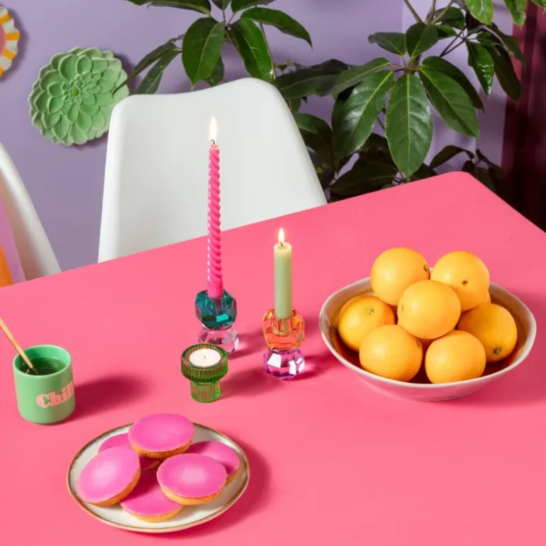 Helemaal on-trend: dinerkaarsen met een twist! Deze dinerkaarsen zorgen voor extra gezelligheid en sfeer. Combineer deze kaars met andere leuke dinerkaarsen en maak het gezellige hoekje helemaal af met een mooie kandelaar erbij. De dinerkaars twist heeft een paarse kleur en een afmeting van ø2.1×25 cm.