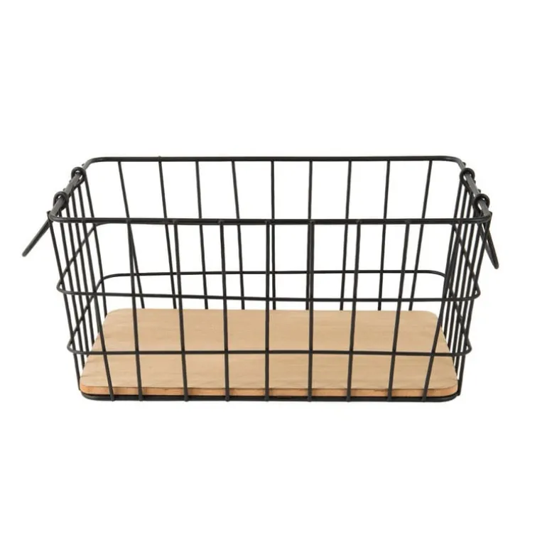 Berg je spulletjes op in dit leuke zwarte mandje van metaal met een bodem van hout, Wat je ook wilt opbergen, dit leuke opbergmandje mag gezien worden. En extra handig, jij ziet ook meteen wat erin zit! Het mandje is van zwart metaal en heeft een afmeting van 31x21x14 cm.