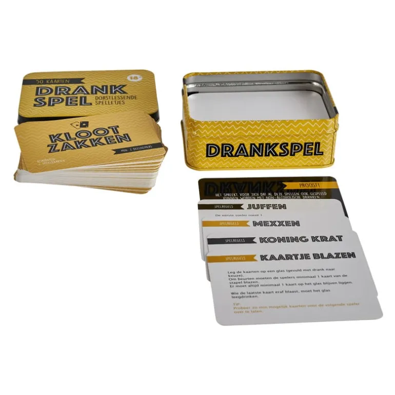 Met dit drankspel zul jij geen moment dorst hebben! Het drankspel bevat 50 dorstlessende spelletjes en is leuk om te spelen met vrienden. Let op: houd het verantwoord en drink met mate! Geniet van een leuke avond met dit drankspel.
