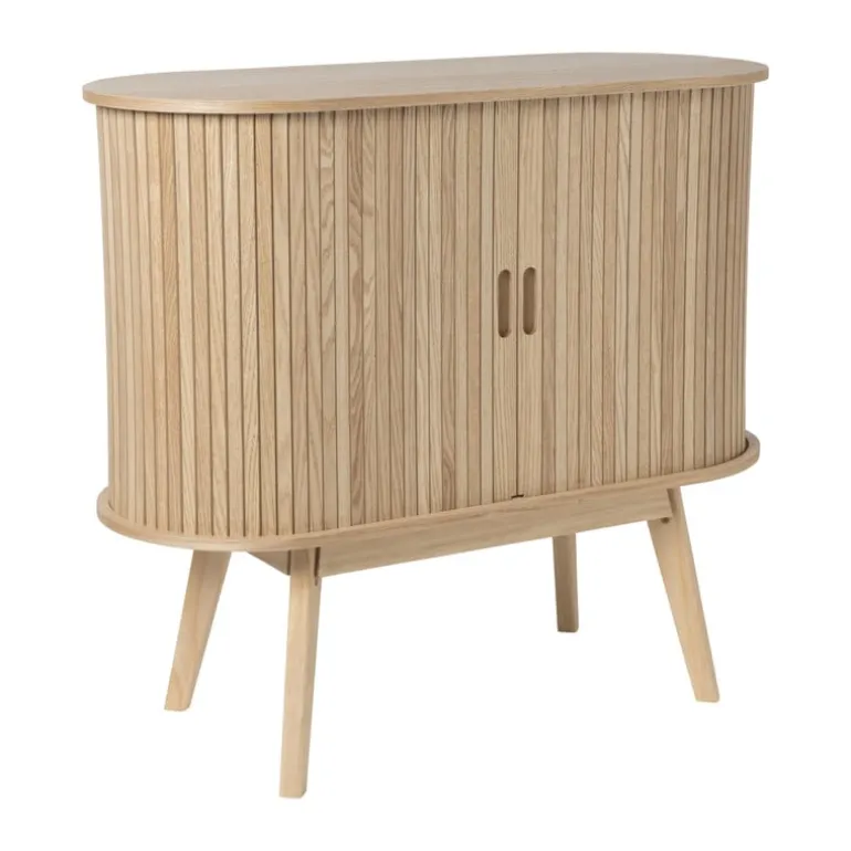 Dit dressoir combineert een minimalistisch design met natuurlijke materialen, wat zorgt voor een rustige en verfijnde uitstraling in elke ruimte. Het dressoir biedt voldoende ruimte om je favoriete decoratie, boeken of kleine planten neer te zetten in je hal, woonkamer of slaapkamer. Sidetable Uppsala past bij vrijwel ieder interieur en is geïnspireerd op de populaire Scandinavische woonstijl. Het is een echte eyecatcher dankzij het ovalen bovenblad, de verticale strepen en de hoge poten.