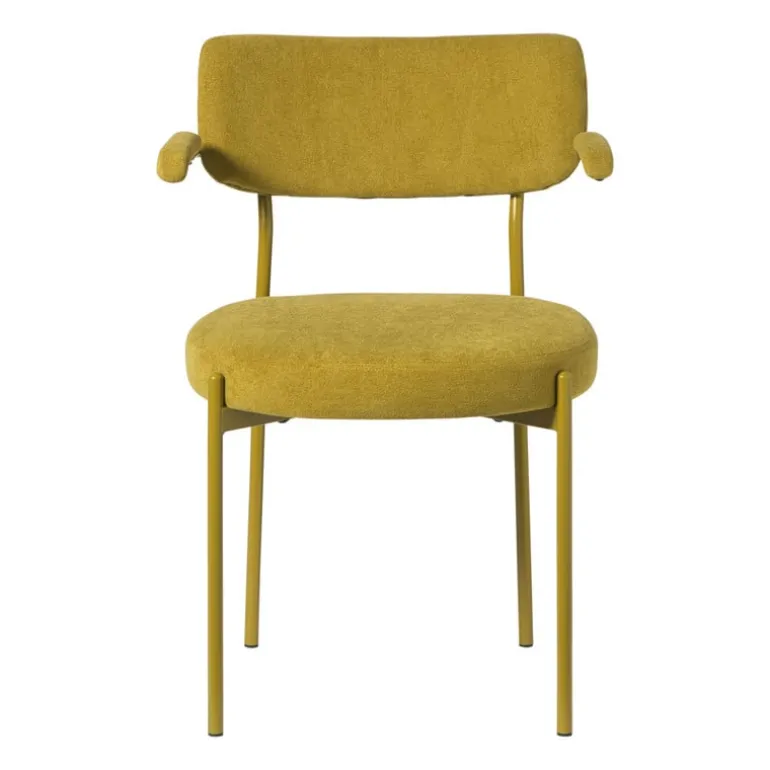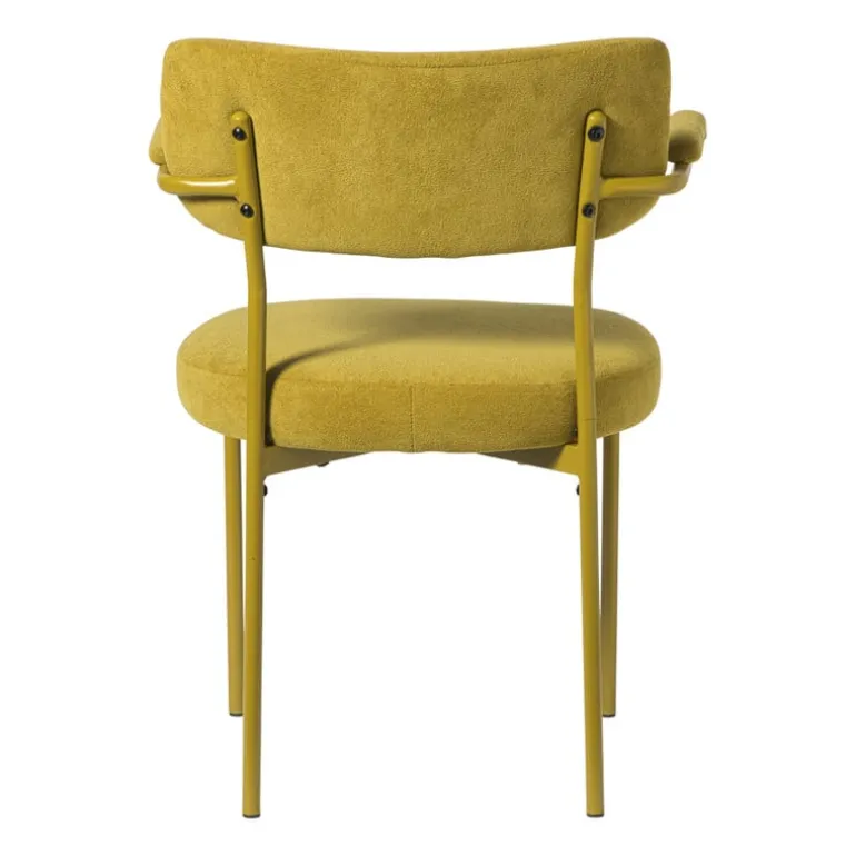 De zachte bekleding van de eetkamerstoel is gemaakt van polyester en het frame van metaal.