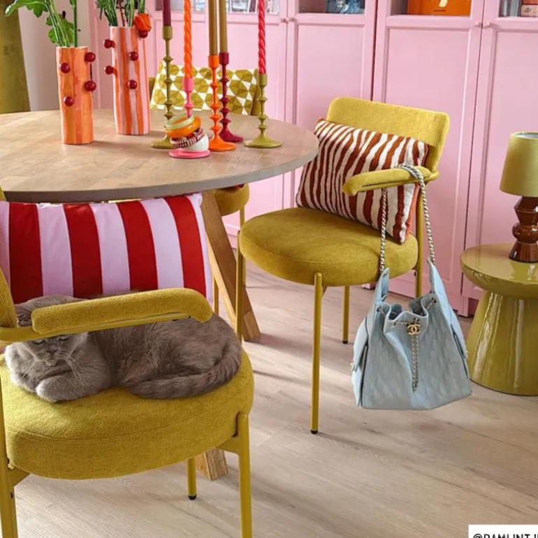 Tip: Combineer Elvis in verschillende kleuren (beige, okergeel en groen) voor een verrassend effect aan je eettafel. Zo maak je van je eetkamer een gezellige mix van comfort en karakter!