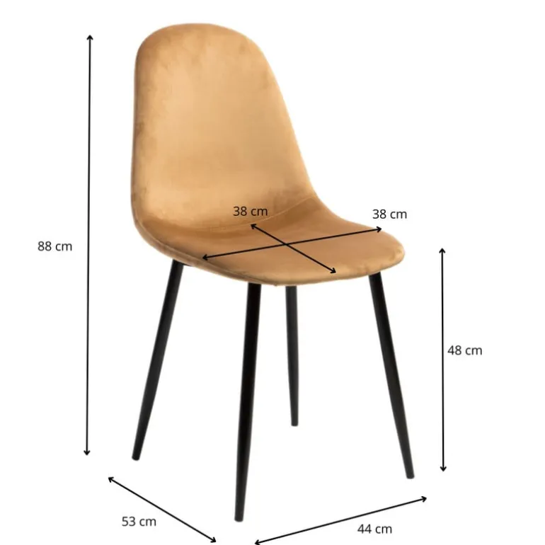 De stoel heeft een hoogte van 88 cm, een breedte van 44 cm en een diepte van 53 cm. De zithoogte van de velvet stoel is 48 cm, de zitbreedte 38 cm en de zitdiepte 38 cm.