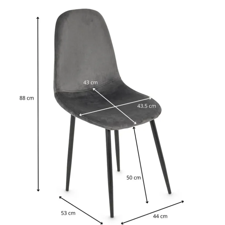 De stoel is 88 cm hoog, 44 cm breed en 53 cm diep. De zithoogte van de velvet stoel is 50 cm, de zitbreedte is 43.5 cm en de zitdiepte is 40 cm.