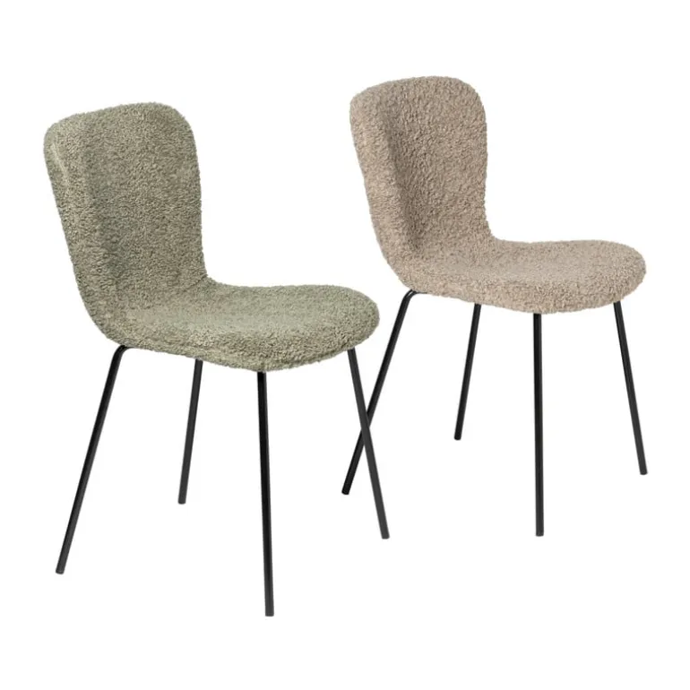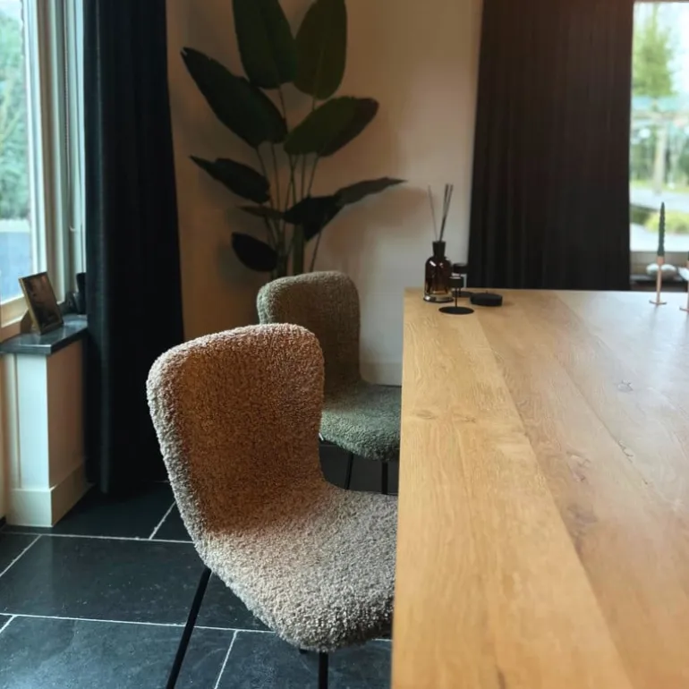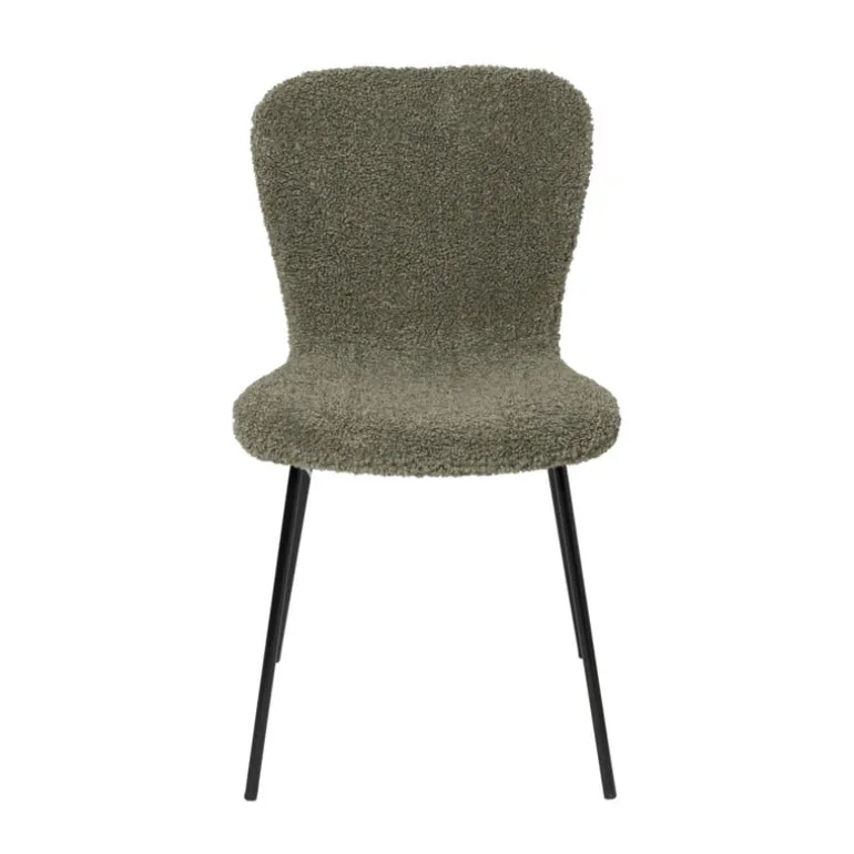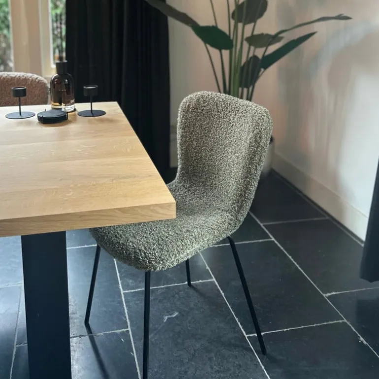 Met eetkamerstoel Liz breng je warmte en stijl naar je eetkamer. De stoel in het groen is bekleed met een trendy teddy stof, die niet alleen heerlijk zacht aanvoelt, maar ook een knusse uitstraling geeft aan je interieur. Het strakke ontwerp met afgeronde hoeken en slanke, zwarte metalen poten maakt deze stoel een perfecte mix van modern en gezellig. De stoel is voorzien van een stevig metalen frame en een comfortabele zitting en rugleuning.