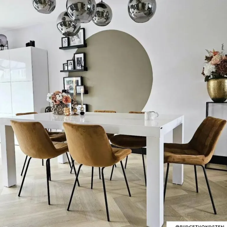 De eetkamerstoel is gemaakt van velvet en metaal.