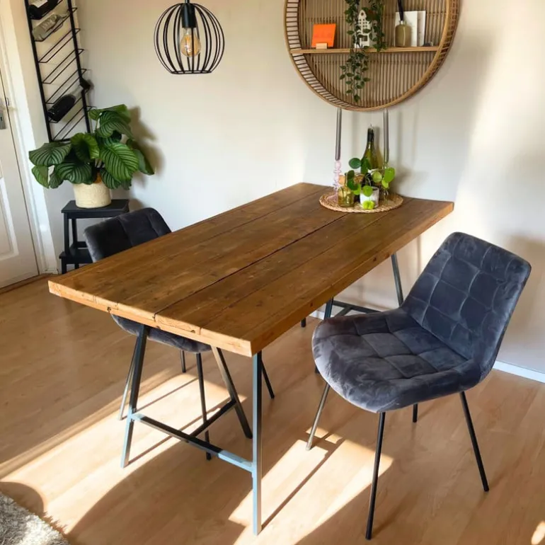 De eetkamerstoel is gemaakt van velvet en metaal.