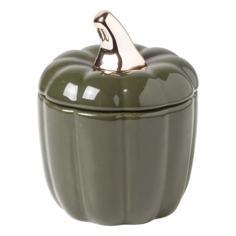 Breng een warme sfeer in huis met deze prachtige groene geurkaars in de vorm van een pompoen. De kaars staat niet alleen gezellig in je herfst interieur, maar verspreid ook og eens een heerlijke geur. Met een doorsnede van 10 cm en een hoogte van 12 is deze stijlvolle geurkaars perfect als eyecatcher op je tafel, dressoir of in je vensterbank.