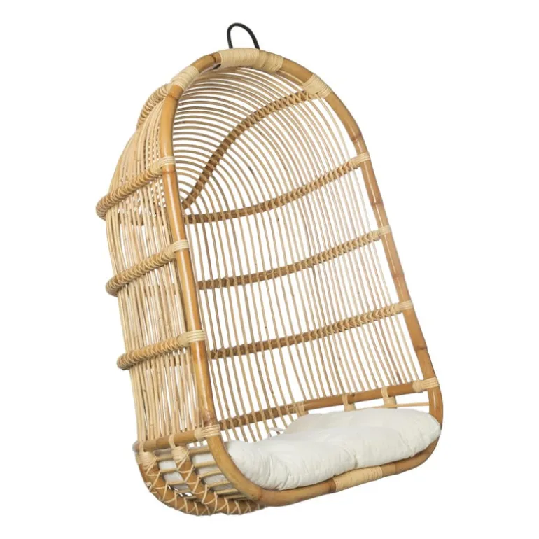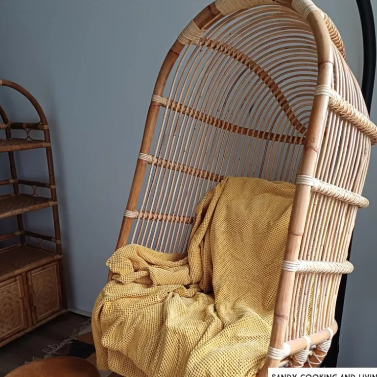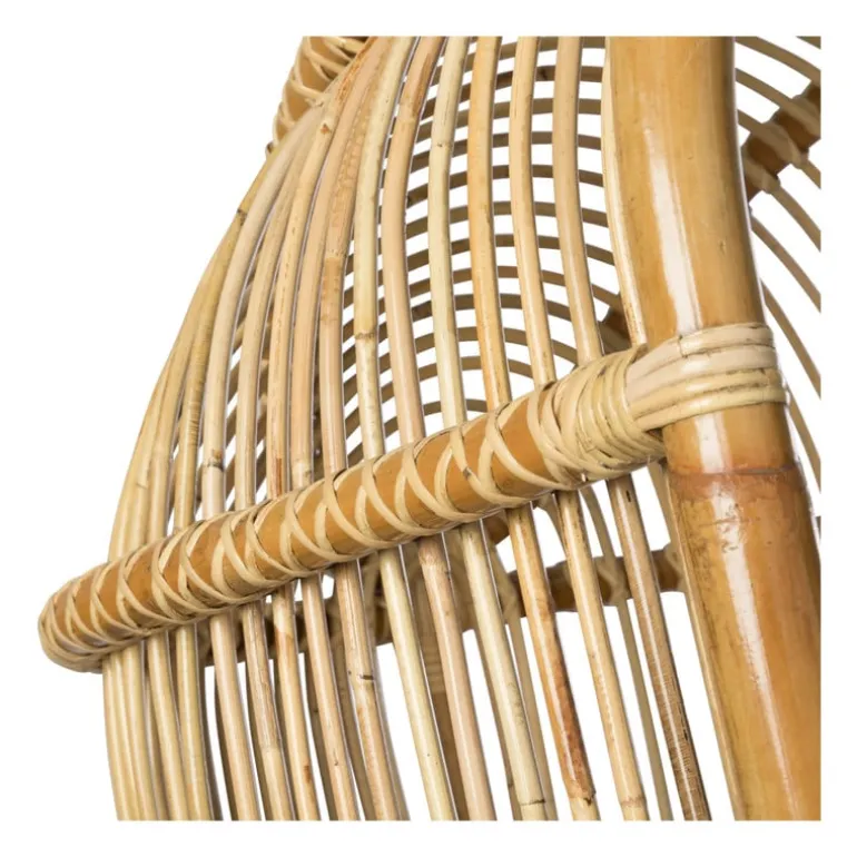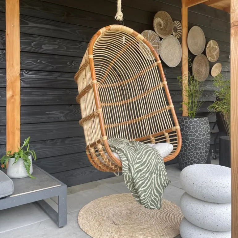 De hangstoel is gemaakt van rotan.