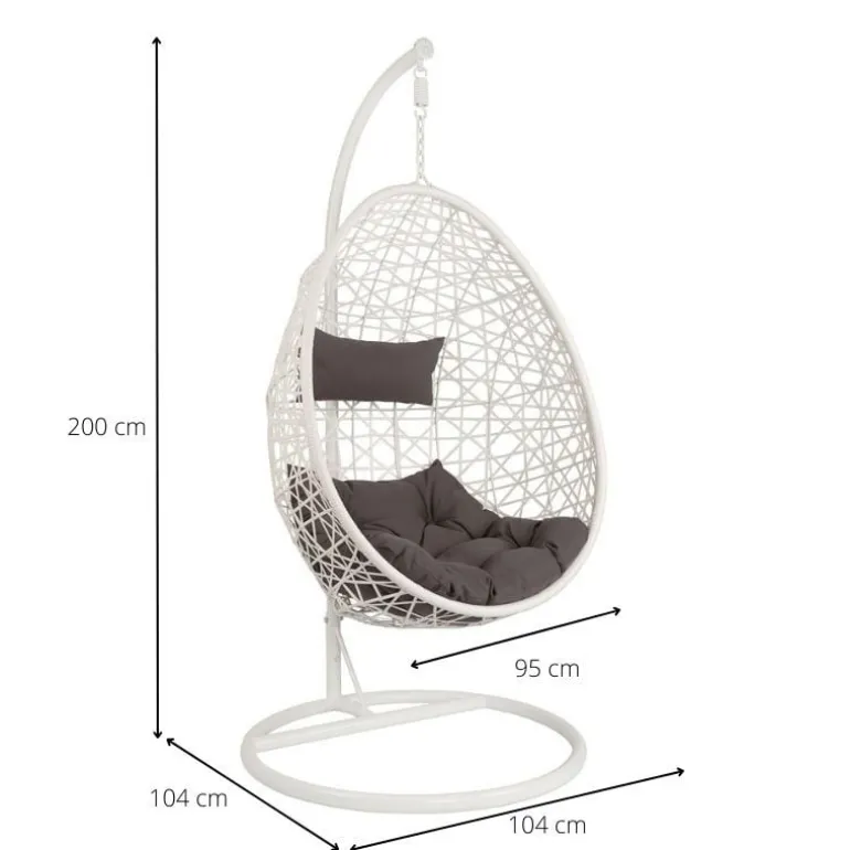 De afmetingen van hangstoel swing zijn 95x95x200 cm. De voet heeft een diameter van 104 cm. De mand van deze hangstoel is 125 cm hoog, 95 cm breed en 63 cm diep.