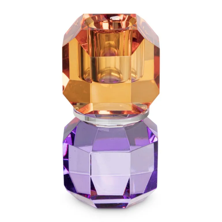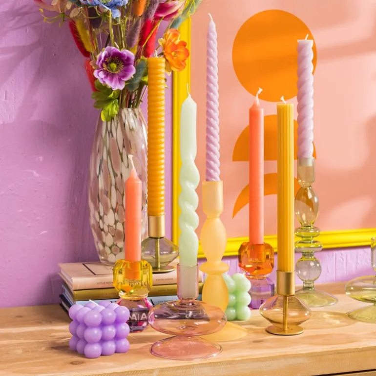 Deze dinerkaarshouder is funky, kleurrijk en modern. Combineer de kandelaar met twisted kaarsen in verschillende kleuren voor een gezellig en stijlvol hoekje in huis. De kandelaar is 9 cm hoog en gemaakt van kristalglas.