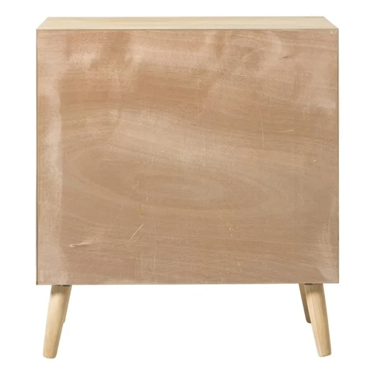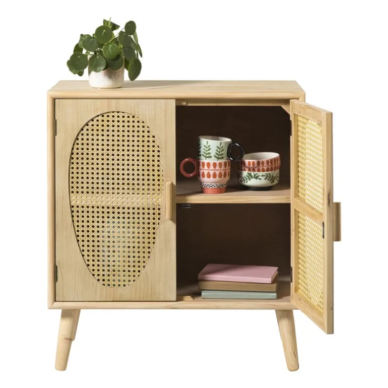 Deze kast met ovale webbing panelen is precies wat je zoekt. Niet te groot, niet te klein en perfect voor onder een spiegel in de hal, als compact opbergkastje in de keuken of voor extra sfeer in de slaapkamer. De combinatie van bruin hout met luchtige rotan details geeft je interieur een warme en natuurlijke uitstraling met een moderne twist.