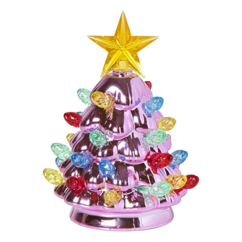 Deze paarse kerstboom van 11 cm met LED lichtjes past perfect op je bureau of nachtkastje. Een vrolijke mini-versiering die meteen sfeer geeft.