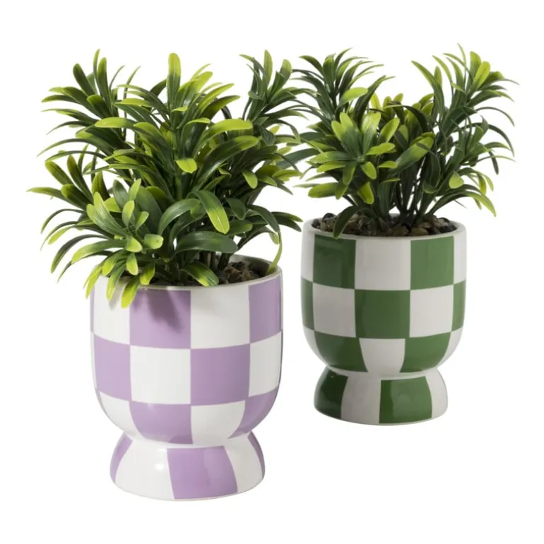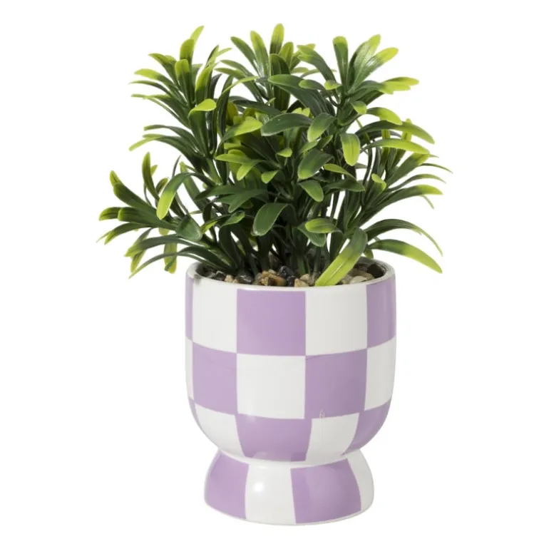Dit leuke plantje in geblokt vaasje verdient een mooi plekje in jouw interieur. Het plantje met vaas is gemaakt van dolomiet, steen en polyetheen. Zet ‘m gezellig neer in de vensterbank, vakkenkast of op je salontafel. Het plantje met geblokte vaas is paars met wit van kleur, heeft een doorsnede van 8 cm en een hoogte van 17 cm.