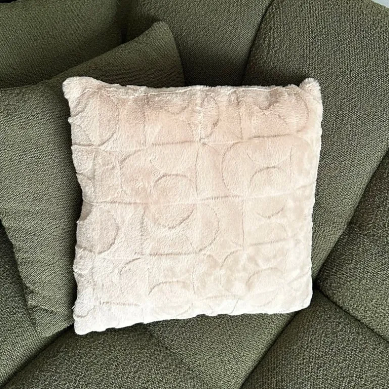 Het kussen is effen beige aan de achterkant en is voorzien van een ritssluiting aan de onderkant. Het kussen is niet wasbaar, kleine vlekken kunnen worden verwijderd met een vochtige doek.