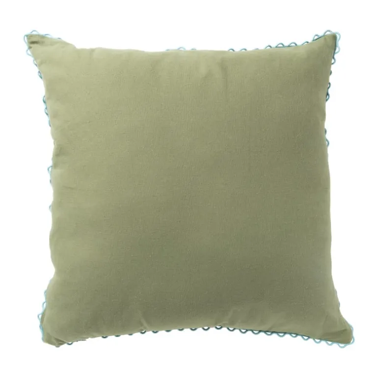 Het kussen is effen groen aan de achterkant en voorzien van een ritssluiting aan de onderkant. Het kussen is niet wasbaar, kleine vlekken kunnen worden verwijderd met een vochtige doek.