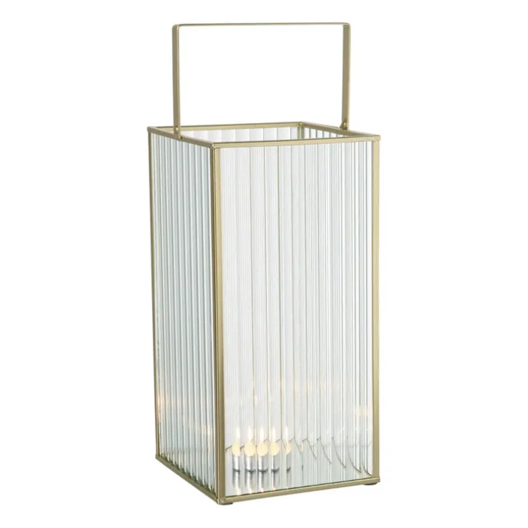 Deze glazen lantaarn met ribbelstructuur en gouden afwerking is een echte eyecatcher. Met zijn formaat staat hij prachtig op tafel, in de vensterbank of buiten op een zwoele avond.