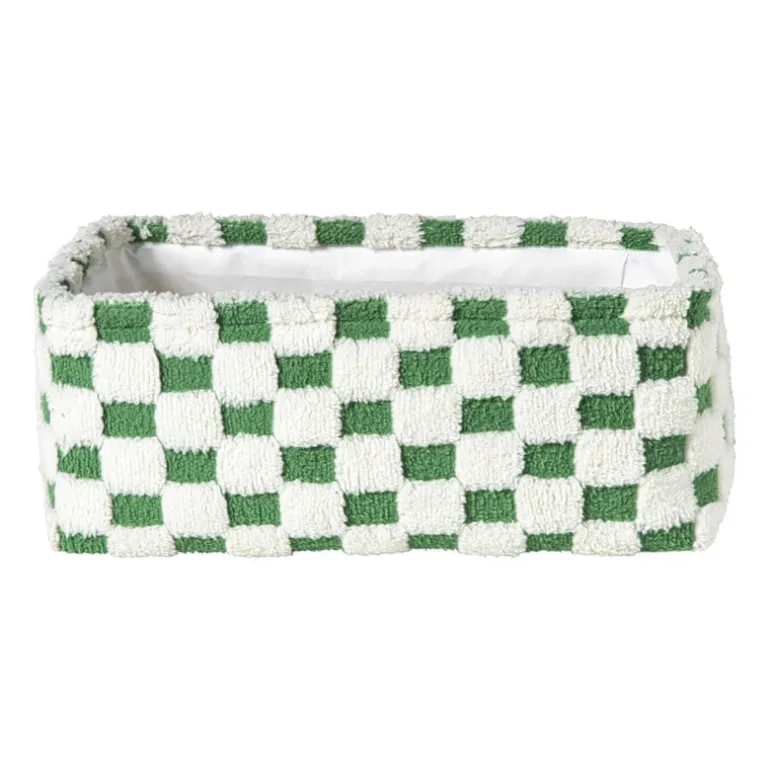 Deze mand in groen met wit is ideaal voor kleinere ruimtes. Met een formaat van 15x36x26 cm past hij perfect op een plank of in een kast, ideaal voor losse spulletjes zoals sjaals, sokken of badkamerartikelen.