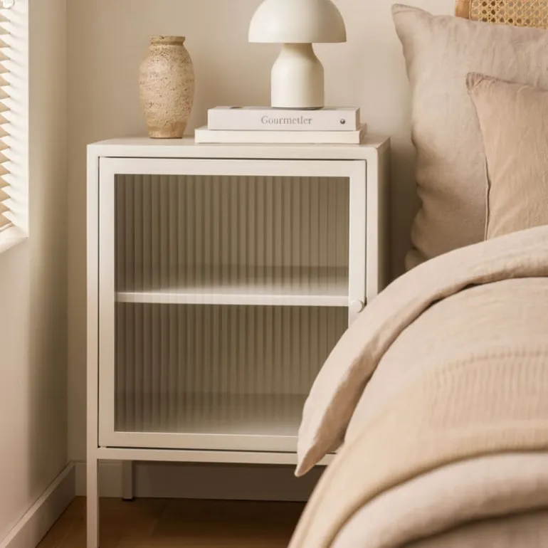 Het nachtkastje Luca is een perfecte mix van minimalistisch design en praktische opbergruimte. Met zijn strakke beige afwerking en het stijlvolle geribbelde glazen deurtje brengt dit kastje rust en elegantie in je slaapkamer. Het compacte formaat maakt het nachtkastje ideaal voor naast je bed zonder veel ruimte in te nemen. Achter het glazen deurtje berg je moeiteloos je boeken, opladers en andere essentials op, terwijl de bovenkant ruimte biedt voor een nachtlamp, wekker of decoratieve items. Dit smalle nachtkastje past moeiteloos in een modern, Scandinavisch of industrieel interieur en zorgt voor een opgeruimde en sfeervolle slaapkamer.