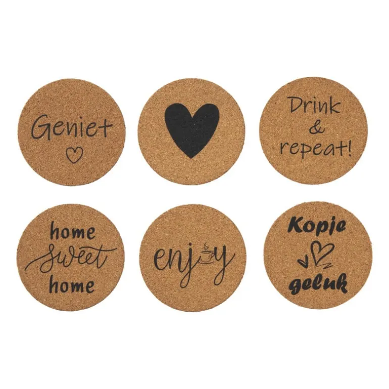 Een onderzetter is natuurlijk onmisbaar op tafel. Het beschermt de tafel tegen nattigheid en krassen. Deze onderzetters met tekst zijn gemaakt van kurk en komen in een set van 6. De vrolijke onderzetters bieden niet alleen bescherming aan je tafel, maar zorgen ook voor een glimlach bij je gasten dankzij de leuke teksten op iedere onderzetter.