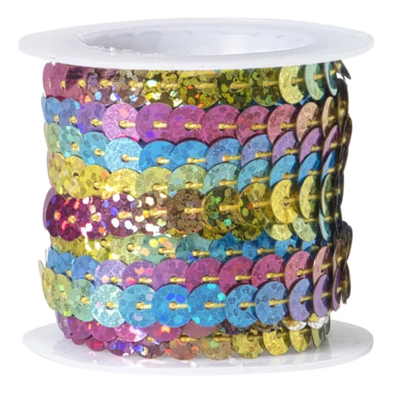 Laat het glinsteren met dit vrolijke pailettenband in multikleur! Perfect voor het versieren van kleding, tassen, hoeden of feestversiering. De kleuren veranderen mee met het licht en geven een speels en feestelijk effect. Met 5 meter op de rol kun je lekker losgaan met je creatieve plannen. Ideaal voor carnaval, verkleedpartijtjes, DIY-projecten of gewoon omdat je van glitter houdt.