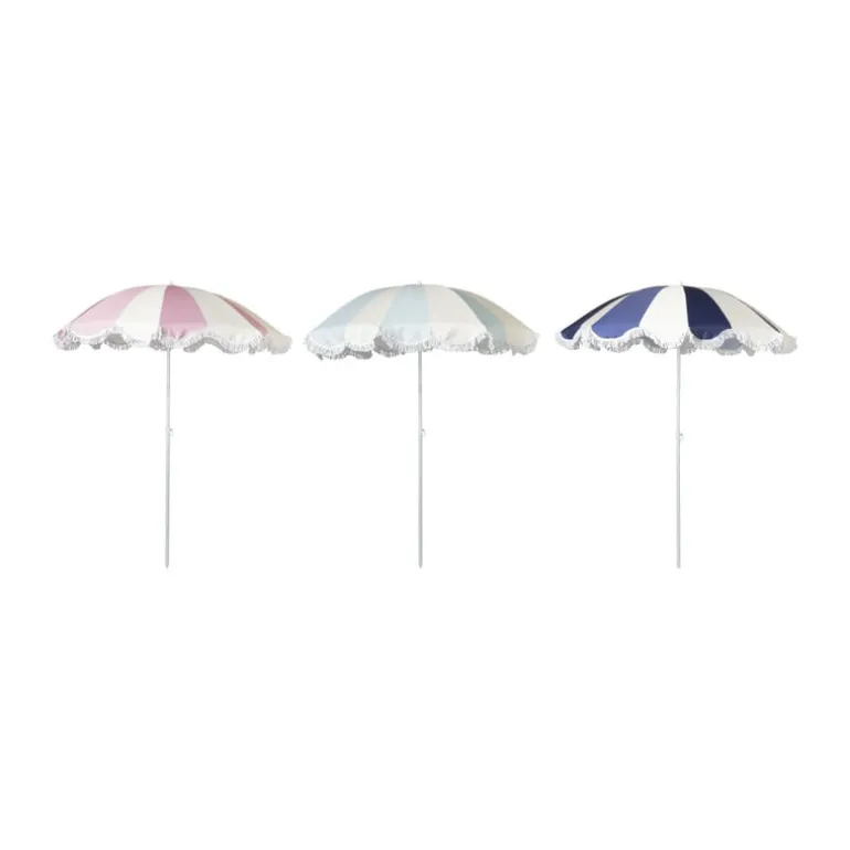 Wie wordt er niet vrolijk van deze gestreepte parasol? De blauw met wit gekleurde parasol zorgt voor een schaduwplekje zodat je even kan afkoelen. Je neemt de parasol makkelijk mee naar het strand maar in de tuin of het balkon staat ie ook gezellig. De parasol is gemaakt van metaal en polyester en heeft een doorsnede van 160 cm en een hoogte van 180 cm.