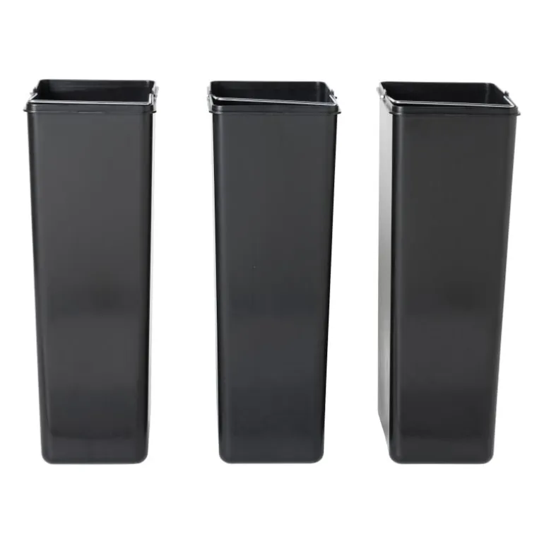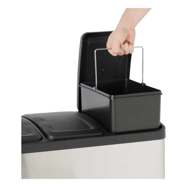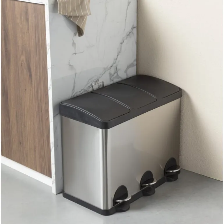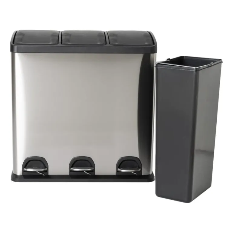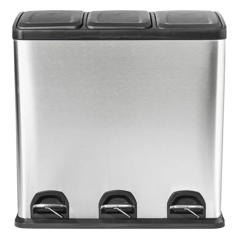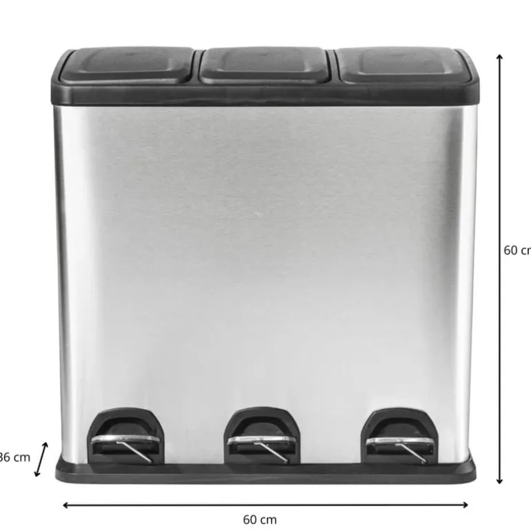 Deze pedaalemmer triple bin is een absolute must-have als je graag je afval wilt scheiden. De recycle vuilnisemmer van 60 liter bestaat namelijk uit 3 aparte delen van ieder 20 liter. Handig! Gebruik de eerste emmer voor het restafval, de tweede voor papier en de derde emmer voor het groene afval. De pedaalemmer is eenvoudig en hygiƫnisch te openen met behulp van het voetpedaal. De binnen-emmers van 20 liter zijn gemakkelijk uit de prullenbak te halen dankzij het hengsel. Het verwisselen van een vuilniszak is dus een eitje. De pedaalemmer is gemaakt van RVS, waardoor de afvalbak een modieuze uitstraling krijgt. Wanneer je deze pedaalprullenbak dus in de keuken zet, zal dat er zeker niet verkeerd uit zien. Modieus, mooi, verantwoord en ook nog praktisch, dat is deze pedaalemmer met 3 vakken van in totaal 60 liter. De pedaalemmer is 60 cm hoog, 60 cm breed en 36 cm diep.