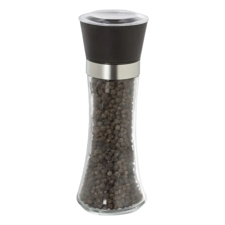 Een fijne pepermolen is onmisbaar in iedere keuken. Met deze handige pepermolen heb je altijd verse peper bij de hand. De pepermolen is gemaakt van glas en is zwart van kleur. De pepermolen heeft een diameter van 6 cm en een hoogte van 18 cm.