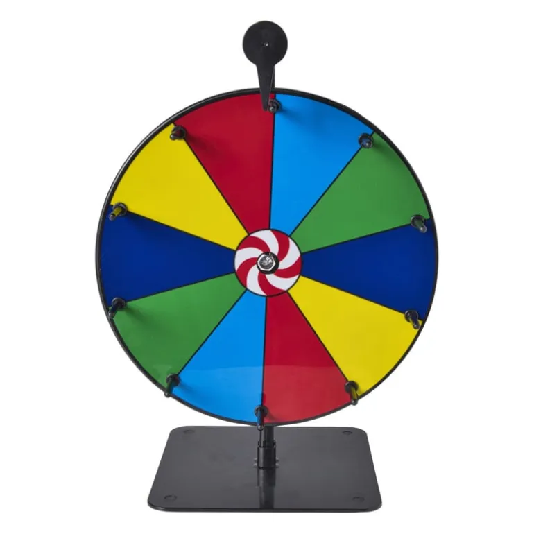 Laat het lot beslissen met dit vrolijke prijzenrad! f je nu een spelletjesavond organiseert, een tombola op school runt, of een hilarische draai wil geven aan een bedrijfsborrel: dit rad zorgt voor instant spanning en plezier. Schrijf zelf de prijzen, opdrachten of grappige uitdagingen op de vlakken met de bijgeleverde stift – van “shotje nemen” tot “doe een dansje” – jij bepaalt. En het leukste? Het oppervlak is uitwisbaar, dus je gebruikt ‘m gewoon opnieuw en opnieuw. Compact, kleurrijk én een gegarandeerde publiekstrekker. Het rad heeft een diameter van 35 cm en een totale hoogte van 48.2 cm.