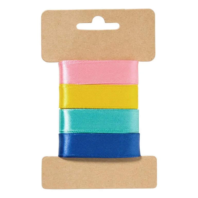Lintje erom en klaar! Deze set van vier satijnen linten in vrolijke pastelkleuren is perfect om je cadeaus, traktaties of knutselprojecten nét dat beetje extra te geven. Denk aan roze, turquoise, zonnig geel en zachtblauw. Glanzend, soepel en supermakkelijk om mee te werken. Gebruik ze om in te pakken, te versieren of gewoon om je dag op te fleuren. Want alles wordt leuker met een strikje.