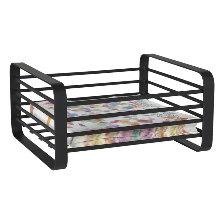 Houd je servetten netjes en georganiseerd met deze zwarte metalen servettenhouder. Dankzij het open ontwerp kun je servetten makkelijk pakken, terwijl ze toch stevig op hun plek blijven. De matzwarte afwerking voegt een moderne en elegante touch toe aan je eettafel of keuken. Met een afmeting van 18 x 16 x 10 cm is deze houder geschikt voor zowel kleine als grote servetten.