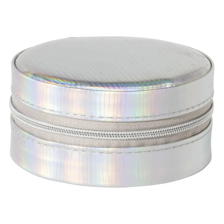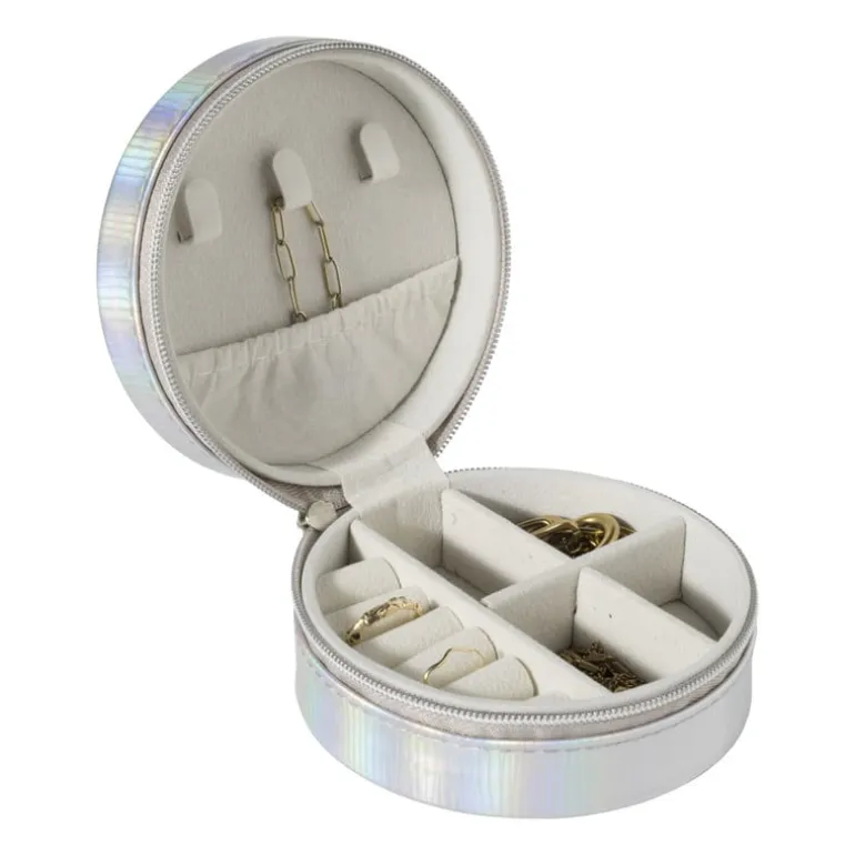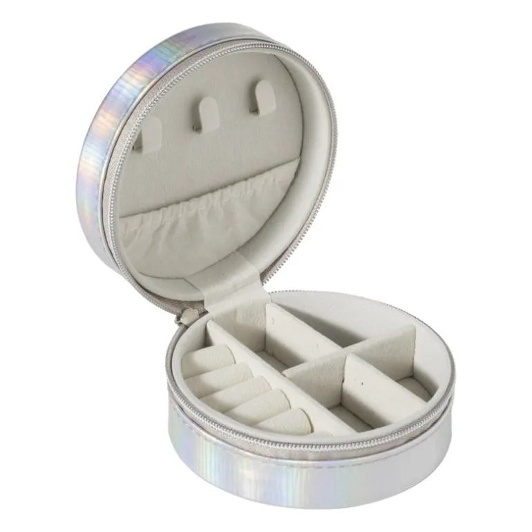 Laat je sieraden schitteren in deze iriserende sieradendoos. De zilveren glans met regenboogeffect maakt hem een ware eyecatcher. Met een diameter van 9.5 cm en een hoogte van 4.4 cm is er voldoende ruimte voor je mooiste sieraden. De binnenkant van het sieradendoosje is slim ingedeeld met meerdere vakjes voor het opbergen van je kleine sieraden en zachte kussentjes speciaal voor je ringen. Praktisch én prachtig!