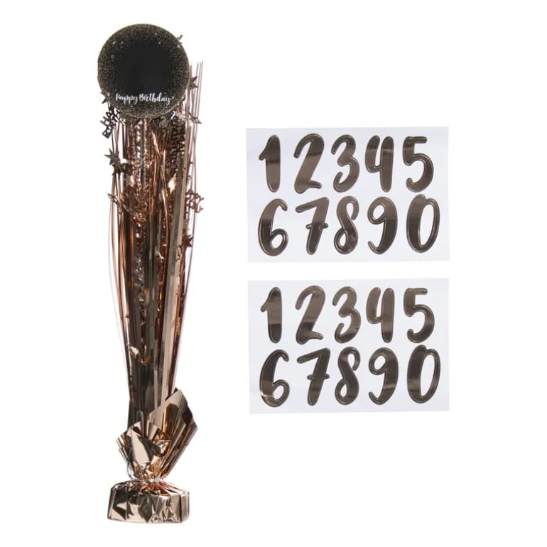 Met deze rosé goud tafeldecoratie geef je elk feestje een sprankelende touch! De decoratie bestaat uit glinsterende folie en sterren, met een vrolijke cirkel met ‘happy birthday’ erin op de top (perfect om een foto van de jarige op te plakken!). Ideaal voor op een feesttafel, naast de taart of als centerpiece. Dankzij de bijgevoegde stickervellen met cijfers maak je hem extra persoonlijk door de leeftijd van de jarige toe te voegen. Perfect voor een feestje vol glitter en glamour!