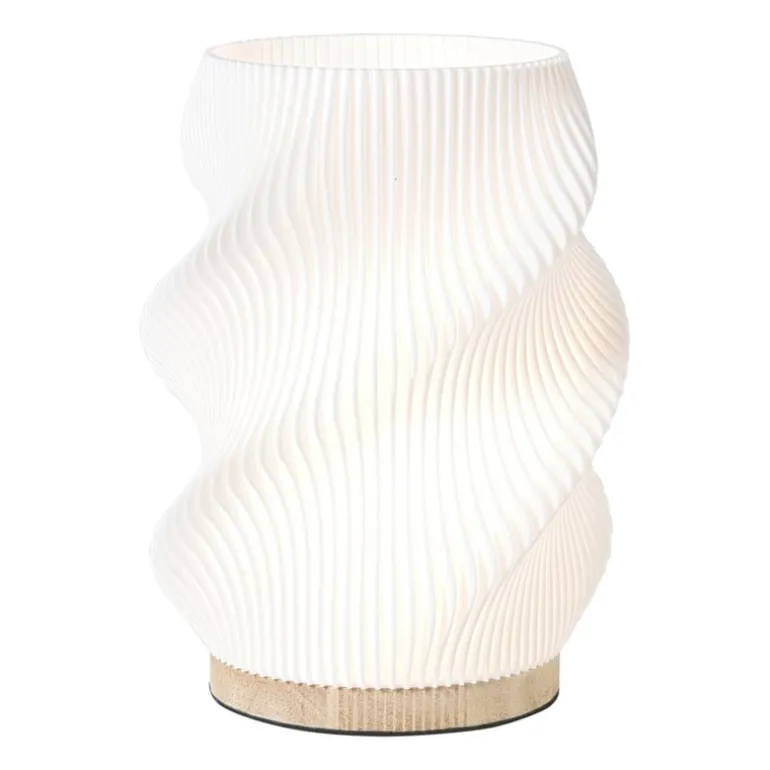 Deze tafellamp met swirl-patroon in fris wit op een houten standaard is een echte sfeermaker. De speelse vorm en zachte gloed maken ‘m perfect voor op je nachtkastje of dressoir. De lamp heeft een warmwit licht en een USB kabel van 1.5 meter.