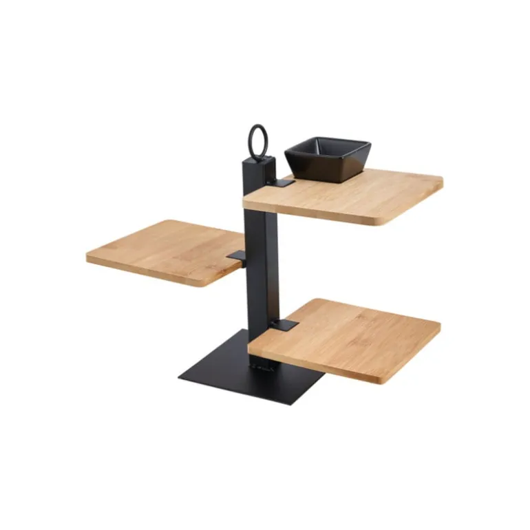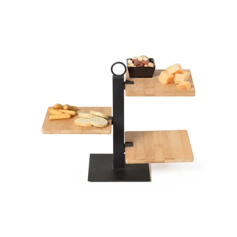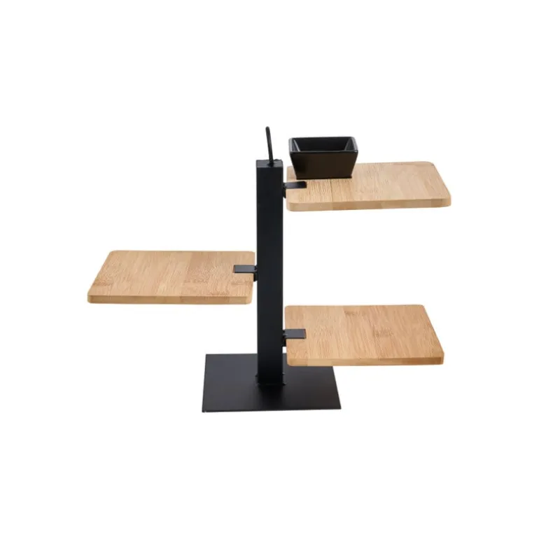 Op deze tapas etagère serveer jij je hapjes nu leuker dan ooit. De set bestaat uit een standaard, drie bamboe plankjes en een schaaltje.