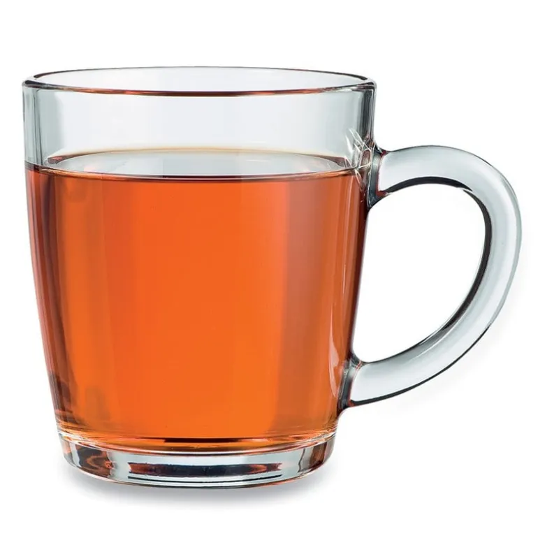 Met dit grote theeglas hoef je niet elk kwartier opnieuw in te schenken. Het glas heeft een inhoud van 35 cl en dat is behoorlijk groot voor een theeglas. Dankzij het oor kun je het glas goed vasthouden en is drinken gemakkelijk. Het glas is gemaakt van gehard glas en daarom geschikt voor de vaatwasmachine en de magnetron.