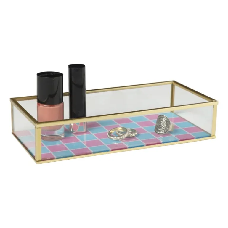De combinatie van goud met speelse roze en blauwe blokjes maakt deze tray een ware eyecatcher in elk interieur. De tray is op veel verschillende manieren te gebruiken: als tray voor je parfums, voor sieraden of voor sleutels of als plateau voor kaarsen. De tray heeft een bodem met geblokt patroon en een hoogte van 4 cm, een breedte van 20 cm een een diepte van 10 cm.