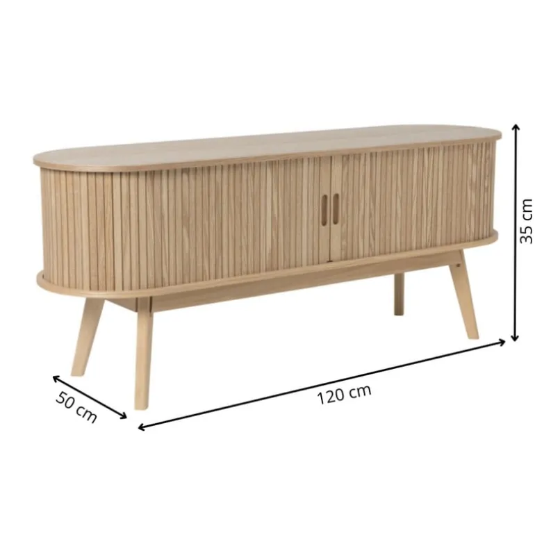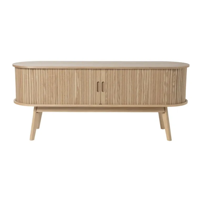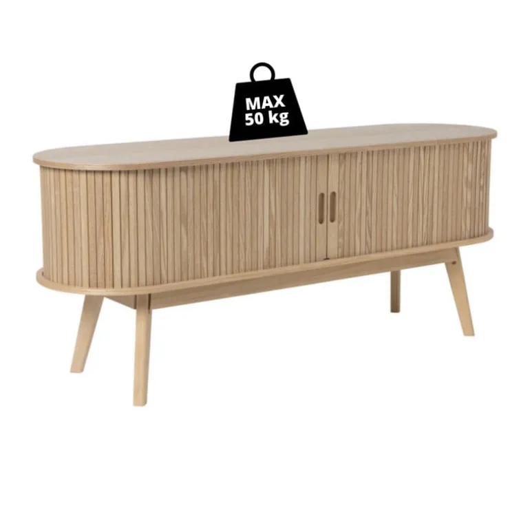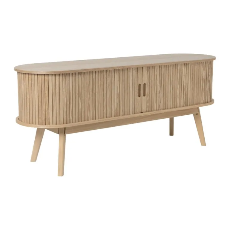 Dit tv-meubel combineert een minimalistisch design met natuurlijke materialen, wat zorgt voor een rustige en verfijnde uitstraling in elke ruimte. Het tv-meubel biedt voldoende ruimte voor je tv, mediaboxen en ander apparatuur. Dankzij de deurtjes zorgt het meubel voor voldoende opbergruimte en houdt het je je woonkamer netjes en georganiseerd. Zet je favoriete decoratie, boeken of kleine planten op het bovenblad van het tv-meubel. Tv-meubel Uppsala past bij vrijwel ieder interieur en is geĆÆnspireerd op de populaire Scandinavische woonstijl. Het is een echte eyecatcher dankzij het ovalen bovenblad, de verticale strepen en de hoge poten. Je reinigt de Uppsala meubels met een vochtige doek.