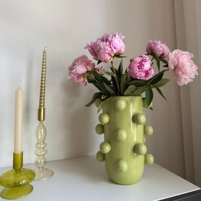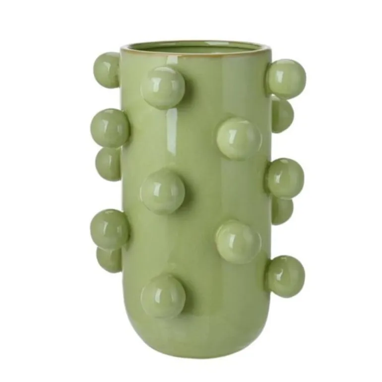 Deze opvallende groene vaas is allesbehalve saai! Dankzij de speelse bollen rondom is dit een echte blikvanger op tafel, in je vensterbank of op een dressoir. De frisse kleur geeft je interieur meteen een vrolijke touch, en door het glanzende keramiek oogt ‘ie extra stijlvol. Perfect voor een paar losse bloemen of gewoon als decoratie op zich – want eerlijk is eerlijk: deze vaas is zó leuk dat hij ook zonder inhoud straalt. Mix & match ‘m met andere gekke vazen of houd het simpel met één eyecatcher. Hoe dan ook: deze vaas steelt de show!