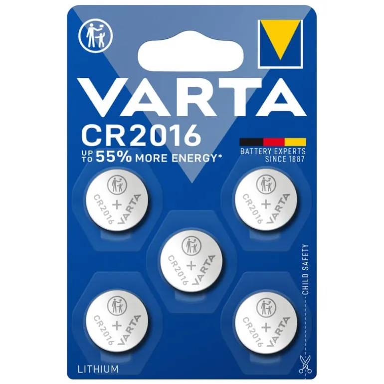 Varta’s lithium knoopcelbatterijen zijn extra premium lithium knoopcellen voor maximale veiligheid, betrouwbaarheid en de modernste energiebehoeften. De beste kwaliteit en levensduur gegarandeerd. Deze Varta CR2016 lithium knoopcel batterijen zijn ideaal voor apparaten die weinig ruimte hebben, maar wel veel energie vragen. Denk aan autosleutels, weegschalen, horloges en rekenmachines. In deze set zitten 5 batterijen, dus je hebt altijd een reserve bij de hand. De batterijen leveren 3V en zijn niet oplaadbaar. De cel heeft een diameter van 20 mm en een hoogte van 1.6 mm.