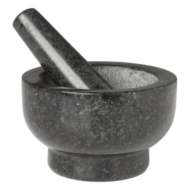 Met deze stijlvolle granieten vijzel maak je van elke kruid en specerij een ware smaakexplosie! Deze vijzel heeft een prachtige zwarte kleur en een afmeting van ø12.5×7.5 cm. Dankzij het hoogwaardige graniet blijft de vijzel stevig op zijn plaats staan tijdens het malen en voegt hij geen smaak of geur toe aan je kruiden en specerijen. De vijzel is geschikt voor zowel droge als natte ingrediënten en is gemakkelijk schoon te maken met warm water en een zachte borstel.