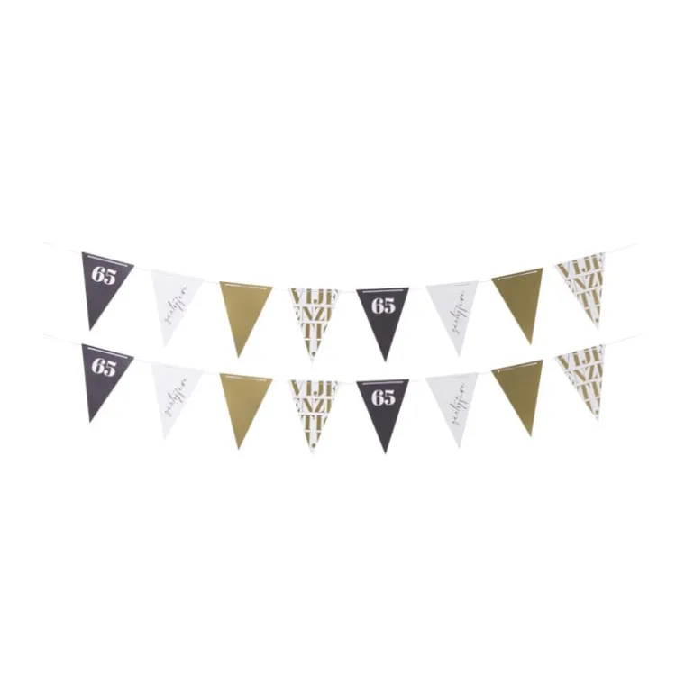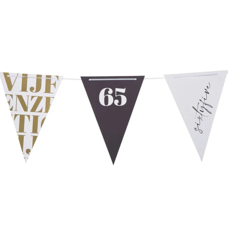 Geen feestje zonder slingers! Met deze vlaggenlijn laat je meteen zien welke mijlpaal er gevierd wordt. De vlaggetjes zijn bedrukt met het juiste cijfer en geven elke ruimte een feestelijke uitstraling. Met een lengte van maar liefst 10 meter kun je flink uitpakken: hang de vlaggenlijn in de woonkamer, door de tuin of boven de feesttafel. Herbruikbaar en ideaal om te combineren met de bijpassende bordjes en servetten.